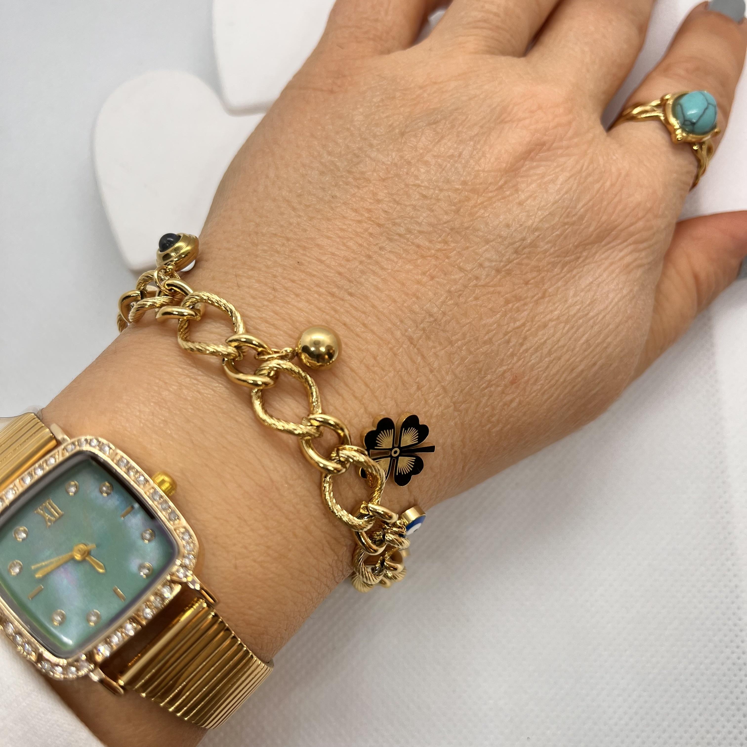 Birbirine geçen halkalı nazar boncuğu ve yonca sallantı detaylı çelik bileklik, zarif ve dikkat çekici bir aksesuardır. Bu benzersiz bileklik, hem göz alıcı bir görünüm sunar hem de nazar boncuğunun koruyucu gücünü bileğinizde taşımanıza olanak tanır.