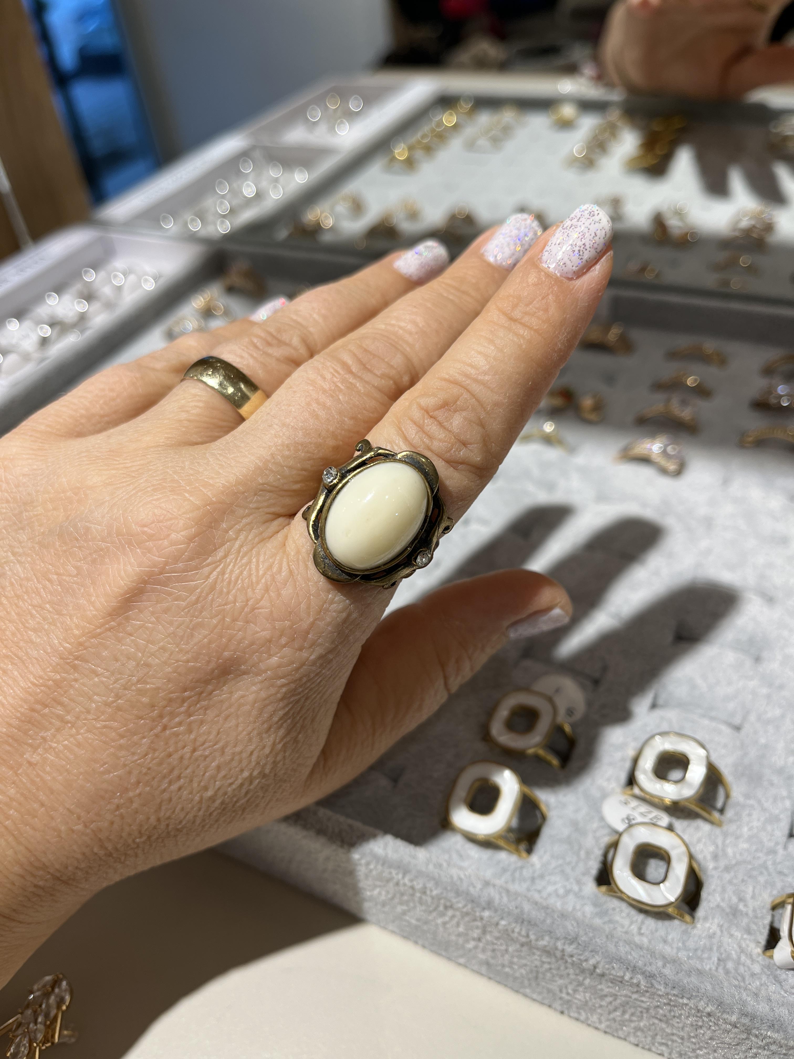 Yüzüğün tasarımı, el işçiliği ile dikkatle oluşturulmuş ve her bir detay özenle işlenmiştir. Bronz malzemesi, zarif bir doku ve sıcak bir ton sunarken, sedef taşları da yüzyıllardır değerli taşlar arasında yer alan, doğanın bu güzel armağanlarını içermektedir. Sedef taşlarının kullanımı, yüzüğe benzersiz bir estetik katarken, her bir taşın kendine özgü deseni ile farklılık yaratır.