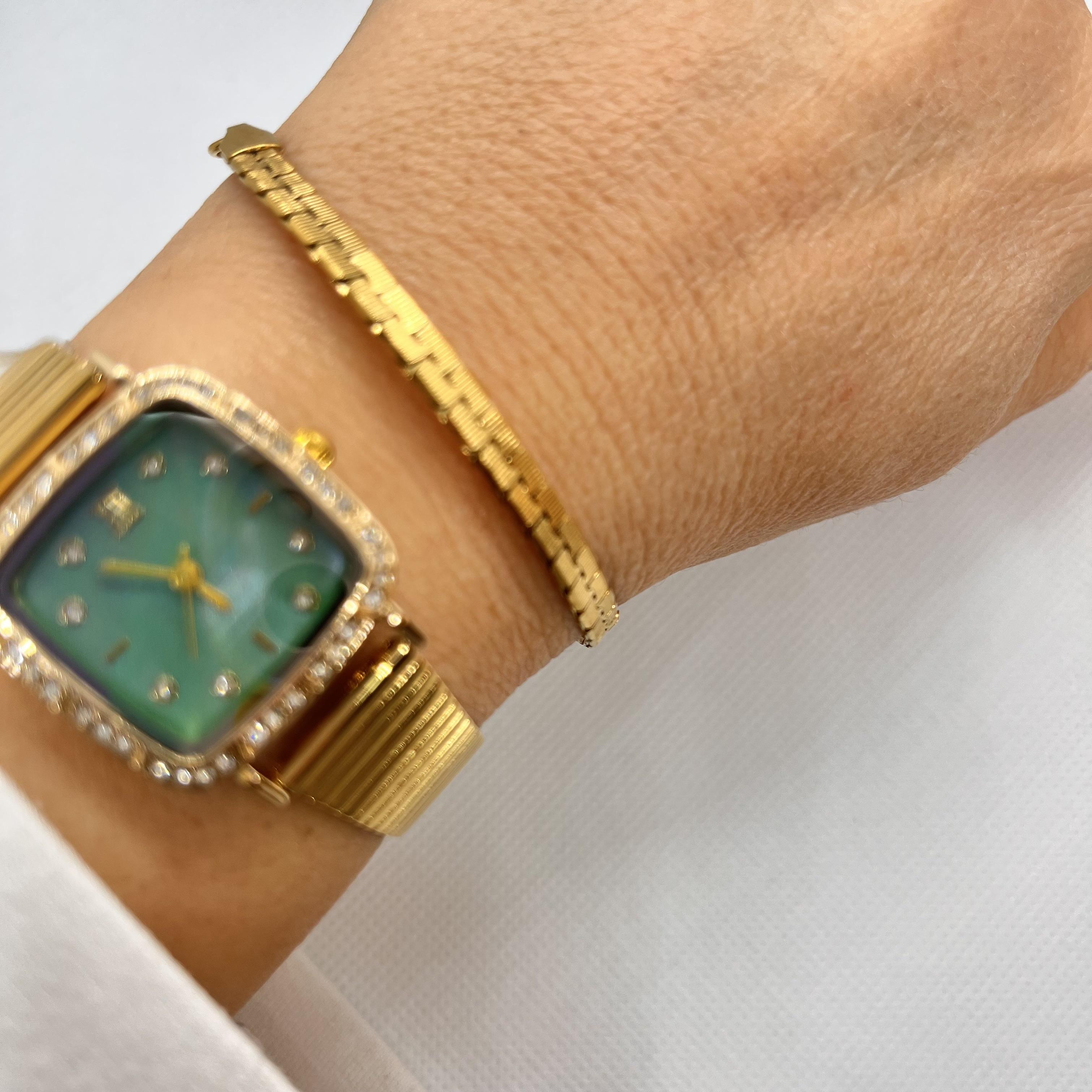 Bu muhteşem bileklik, işlemeli desenlerle süslü ve çelik malzemeden yapılmıştır. Bileklik, zarif ve modern tasarımının yanı sıra sağlam ve dayanıklı yapısıyla da dikkat çekmektedir. Ezme teknolojisi kullanılarak üretilen bilekliğin yüzeyi, ince ve dikkatlice işlenmiş desenlerle süslenmiştir. Bu sayede bilekliğin göz alıcı bir görünüme sahip olmasının yanı sıra parmaklarınızda da hoş bir dokunuş hissi bırakır.