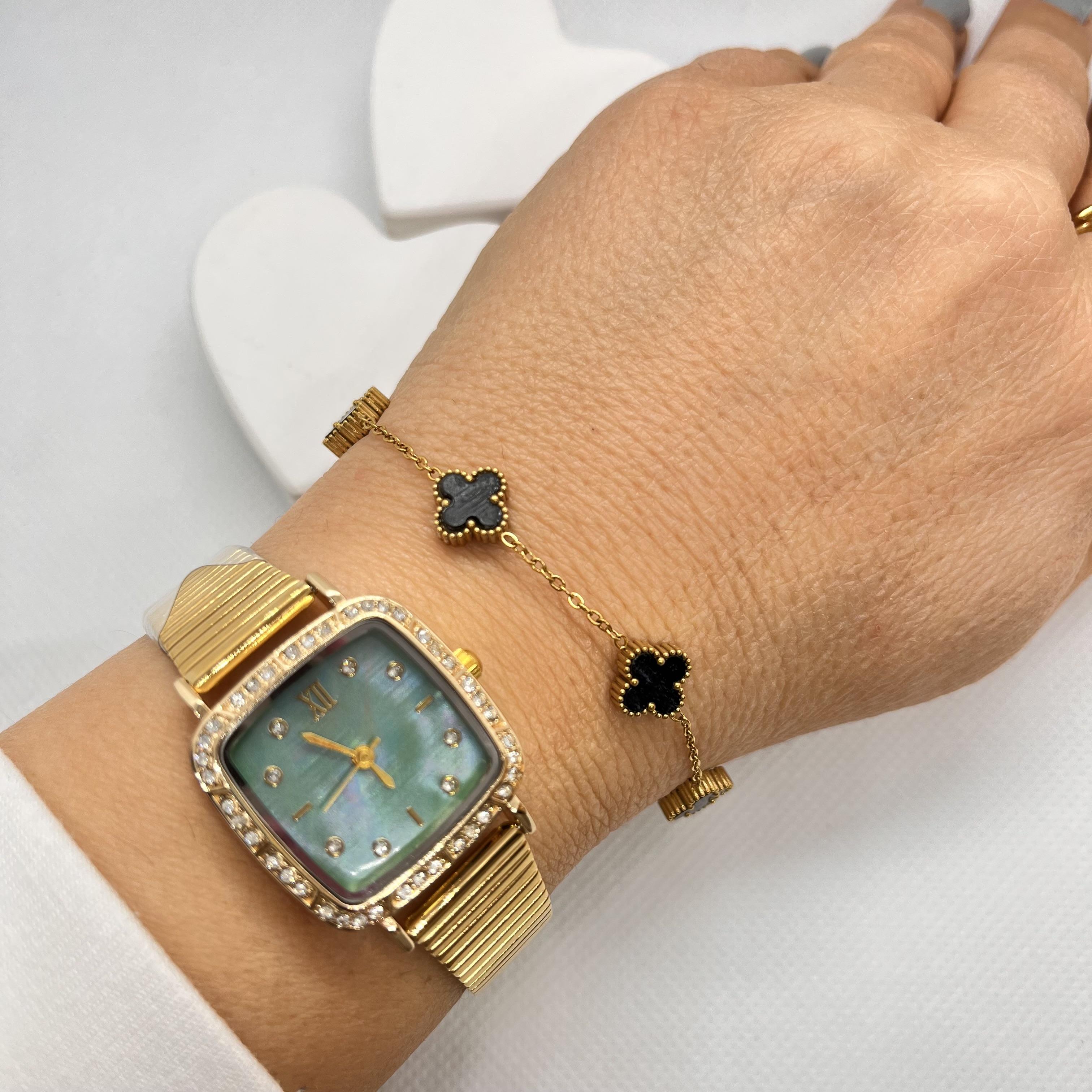 Gold siyah taş detaylı minimal yonca bileklik, zarafetinizi ve tarzınızı tamamlayacak göz alıcı bir mücevherdir. Bu şık bileklik, zarafeti ve sade tasarımıyla dikkat çeken siyah taş detaylarıyla süslüdür. Minimalist temada tasarlanan bu yonca bileklik, sizin için herhangi bir kıyafeti tamamlayıcı bir aksesuardır.